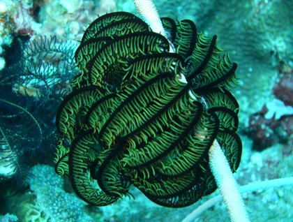 After breakfast everyone goes their preferred way: snorkeling, glass-bottom boating, and diving. I go diving and it is beautiful: lots of color, lots of fish, lots of fun. Being as this place can have a strong current, there are many current feeders about like feather stars, strange relatives of sea stars, and sea urchins know as crinoids to fossil collectors.