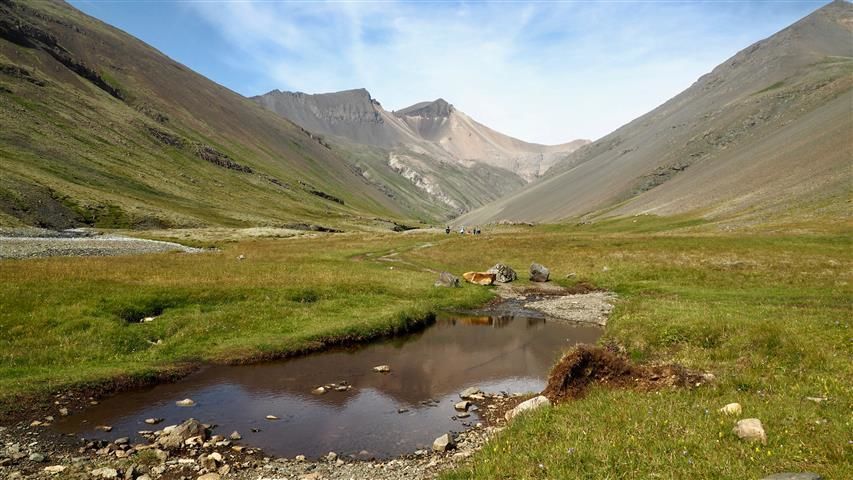 Although the winds delayed our arrival in Djupivogur—and thus the start of our daily activities—once we’d made our way inland, the day turned out to be a ripper. Those of us on the Superjeep tour had blazing sunshine as we traversed rough, rocky terrain to visit spectacular sites such as the Grenisgil canyon and Skógafoss waterfall. Our geologist, Andreas Madsen, had our guests bending down, inspecting the various rocks in the canyon, as he explained the geology behind their colors and composition.