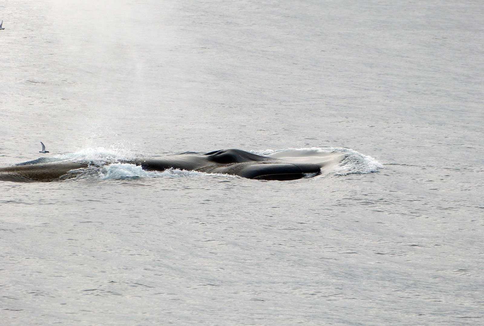 And so, reluctantly, we departed from South Georgia, reflecting upon our experiences around this incredible island. The sea was calm, the ride as smooth as we could ever wish. We were planning to spend our afternoon resting, working on our photos, and listening to interesting presentations. However, Chief Mate Yuriy Tupikov ruined all that when he spotted the spout of a whale. It was a big whale, with a very tall spout and an almost comically small fin set far back on its long body. Yes, we were in the presence of a blue whale, the largest animal on the plane now and ever, its mass dwarfing even the largest of the dinosaurs. We grabbed warm clothing and rushed to our favorite viewing spots as the ship maneuvered to give us excellent views and photo opportunities. Once blue whales were abundant in the Southern Ocean, but they seem to be the slowest of the great whales to recover from the depredation of the 20th-century whalers. We can only hope that, with continuing protection, their populations will again approach their previous numbers, so that others might experience what we were privileged to see today. As we waited for the whale to return to the surface to breath, our attention was drawn to the abundance and diversity of seabirds soaring over the productive ocean, including wandering albatross. In that same moment: the largest of all the whales and the bird with the longest wingspan of all. Wow!