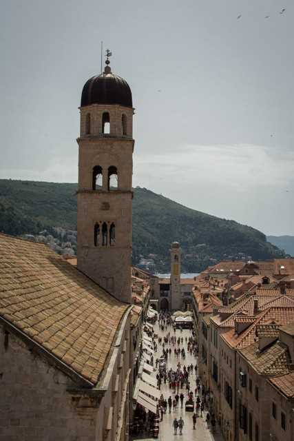 We arrived off the south promontory of the ancient city of Dubrovnik at 7a.m. The sky was a limpid blue and the light from the sea dappled on the great stone walls of this walled medieval city. Immediately facing us across the entrance to the old harbor were the massive high walls of the fortress of St. John. The massive walls of Dubrovnik, just over a mile and a quarter in length, were built in the 10th century and reinforced over the years. They are almost 80 feet high in places and those facing the landside of the city are 20 feet thick. We took tenders into the harbor and landed at the North Pier immediately in front of the Sponza Palace.