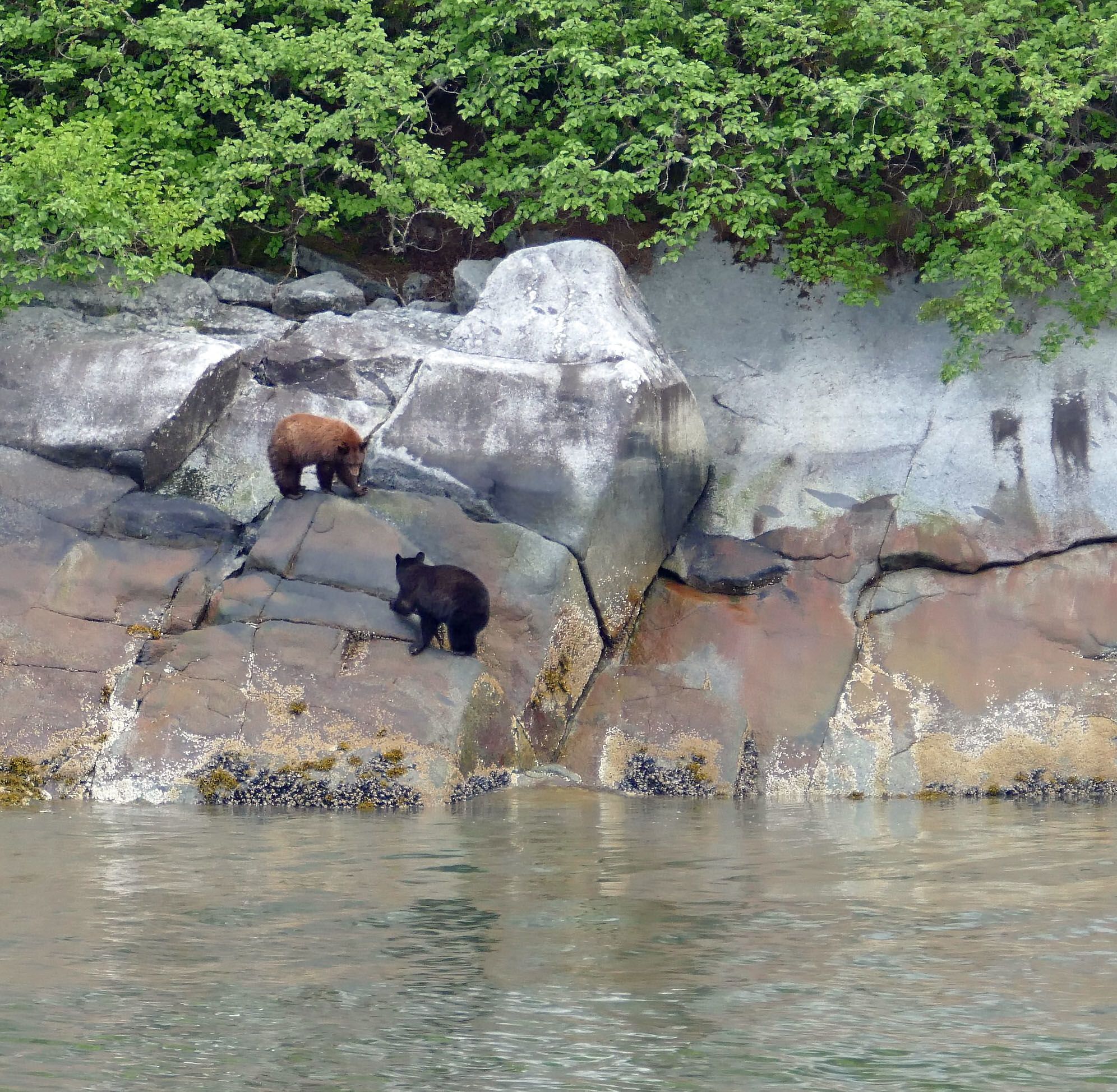 The extreme abundance of life that surrounds us here in Southeast Alaska is astounding. From the towering biomass of the temperate rainforests that earnestly cover the land, to the cold nutrient-rich waters being flushed in from the Pacific Ocean, there is something for all trophic levels. To compliment the diversity of flora and fauna, our morning expedition in Dundas Bay was similarly varied. Bright orange kayaks soon added a splash of color, along with a few more literal splashes, to the placid waters that are protected by rising peaks. Zodiacs zigged, zagged, and zoomed to expand and enhance our range of wildlife sightings. Meanwhile, a small but intrepid group of hikers braved some mud-and-moss-covered moose tracks to explore onshore. Back on the ship and underway, all this effort was rewarded with a hearty lunch and an afternoon treat, cruising out of Icy Strait to join the humpback whales in the suspiciously stalwart summer sunshine.