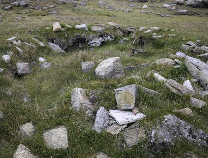 Thule winter houses are in abundance. These circular structures, with a narrow, slightly inclined entrance crawl, were constructed of a combination of stones and grass sods. The roof would originally have been of seal skin stretched across a frame of whale bone or timber. Scattered around each of these houses were fragmented bones of whale, polar bear, seal and walrus. Close by we explored a layer of midden material discarded by the hunter-gatherer inhabitants of this settlement over 800 years ago. Wave erosion is progressively wearing the midden away and bones of a variety of animals were identified including seal, polar bear, caribou, Arctic hare, dog and whale. Bearing cut marks, these are clearly the remnants of meals.