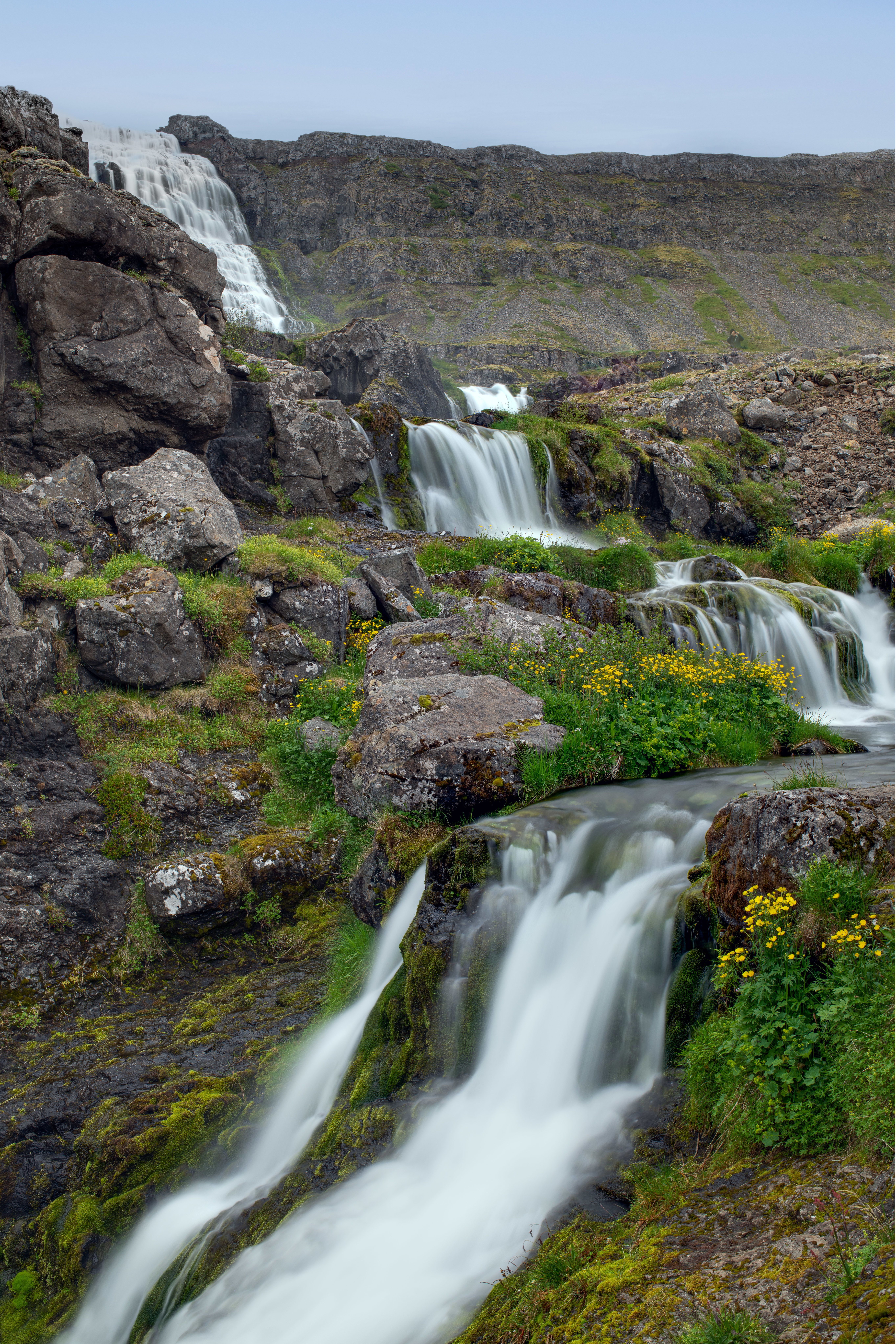Today, we headed to the natural treasure of northwest Iceland, Dynjandi Waterfalls. After a well-prepared breakfast, some guests boarded Zodiacs and landed in the fjord, where they would start a 4-mile hike to the impressive Dynjandi Waterfalls. The ship repositioned shortly after, so the rest of our guests could land closer to the waterfalls, where they could make their way up to the top of them. The area didn’t disappoint, as a series of waterfalls cascaded from a total high of 300 meters (690 feet) above the sea level. The biggest one, Fjallfoss, sits at the very top and it looks exactly as a bridal veil. On top it is 90 feet wide and widens up to 180 feet at the bottom.