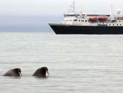 This morning Arctic enthusiasts landed by Zodiac downwind from a group of walruses hauled out at Kapp Lee on Edgeøya island. Just behind the walruses stood three huts, including a unique century-old octagonal one, evidence of humans braving the elements in this same place. We walked past a veritable boneyard of walrus parts, evidence of previous harvesting, to a respectful distance from a pile of a half dozen male walruses, ashore to rest and rub, tusks skyward. These mythical creatures were driven to near extinction after centuries of slaughter for their ivory tusks and for use of their tough skin as machine belts in early industrial days. Protected in Svalbard for over sixty years now, the walruses seem to be reclaiming old territory, including the more recent return of females and calves. It was reassuring to see living walruses today in juxtaposition to the blanching evidence of hundreds of strewn bones. Nutrients leaching out from the bones feed productive moss beds and flowering arctic plants. Life and death go hand in hand somehow. As we quietly observed the beached beasts, more walruses swam in the shallows, curiously investigating the humans ashore.