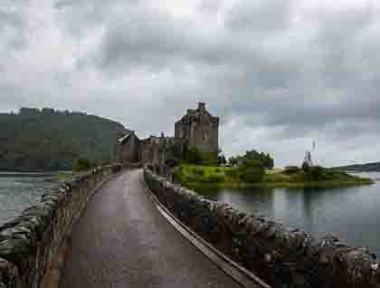 Eilean Donan is probably the most photographed castle in Scotland. Its familiarity derives from numerous encounters from film sets to chocolate boxes. In its current form it dates from the opening decades of the 20th century and is thus representative of a Scottish Revival style that evolved alongside the Arts and Crafts movement. Originally the site of a Celtic anchorite’s cell, the castle name means Donan’s Isle, from the name of the sixth-century saint. It was rebuilt by a descendant of the McCrae clan whose castle ruin it was and inaugurated in the 1920s. The situation is incomparable with a natural tidal moat and mock mediaeval causeway; a photographer’s heaven.