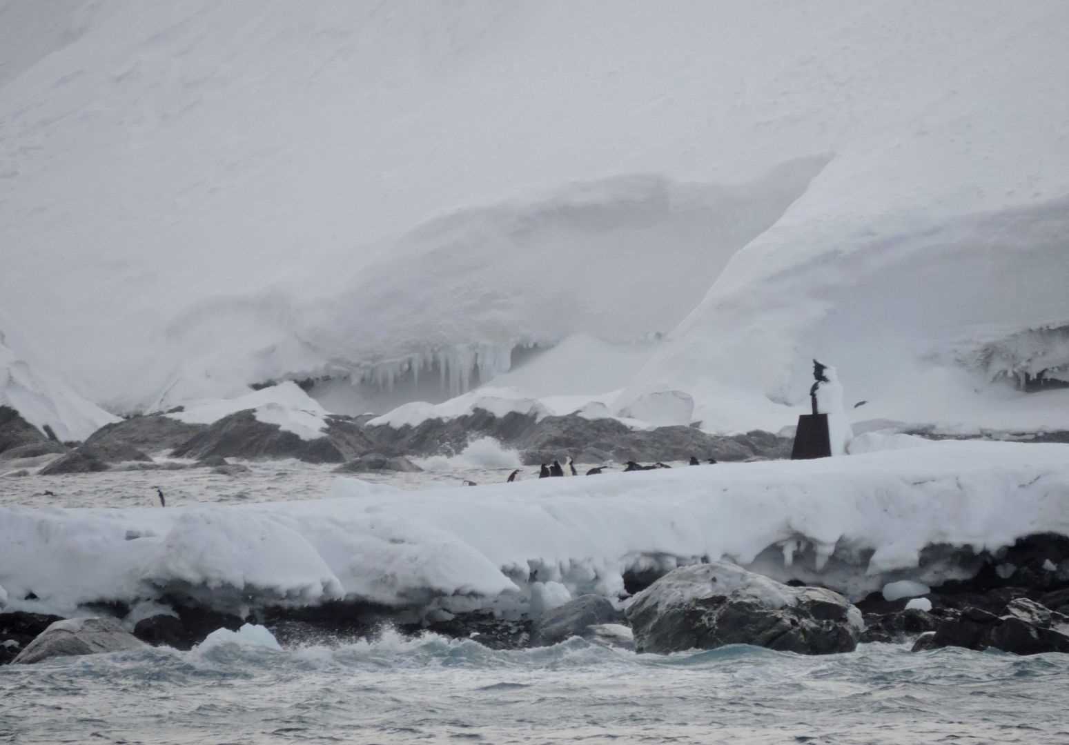 In spite of katabatic winds, complete with impressive will’o’waws, the more hardy, or perhaps fool-hardy, among us went out on Zodiac cruises that got us closer to the shore where the Endurance crew survived under two overturned boats for four desperate months.  As we cruised around the rocks, we could see a statue with the bust of Piloto Luis Pardo, the Chilean captain of the ship Yelcho that Shackleton returned with in August 1916, to finally rescue his crew on Elephant Island.  We also observed hundreds or perhaps thousands of chinstrap penguins sitting and standing around on the snow-covered rocks…waiting for the snow to dissipate, so they could build up their pebble nests and start breeding.