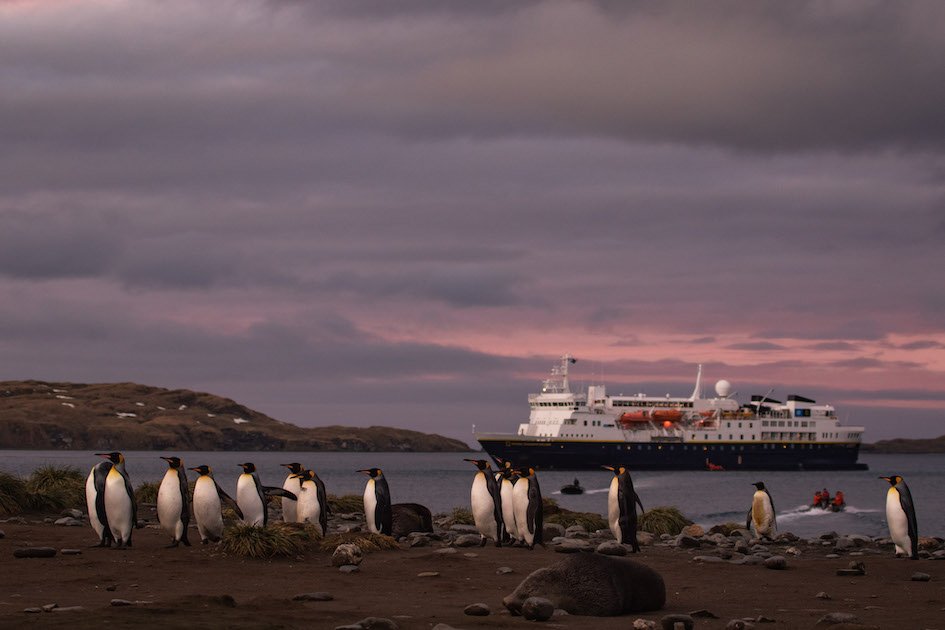 Meanwhile, our undersea team explored the marine environment below, which boasted beautiful clear visibility and impressive kelp forests swaying with the swell. Our first experiences of South Georgia today did not disappoint, but even by dinner time, the day was far from over. Layering up again for our last, but certainly not least, outing of the day, we headed ashore to explore the spectacular wildlife at Salisbury Plain. Pictured against a backdrop of beautiful mountains, tremendous numbers of king penguins of all ages beckoned to us past the enormous elephant seals crowding the shoreline. As the sky shifted through a stunning spectrum of color, it was hard to believe just one place could deliver so much in a single day, but easy to go to bed knowing that there would be so much more still to come.