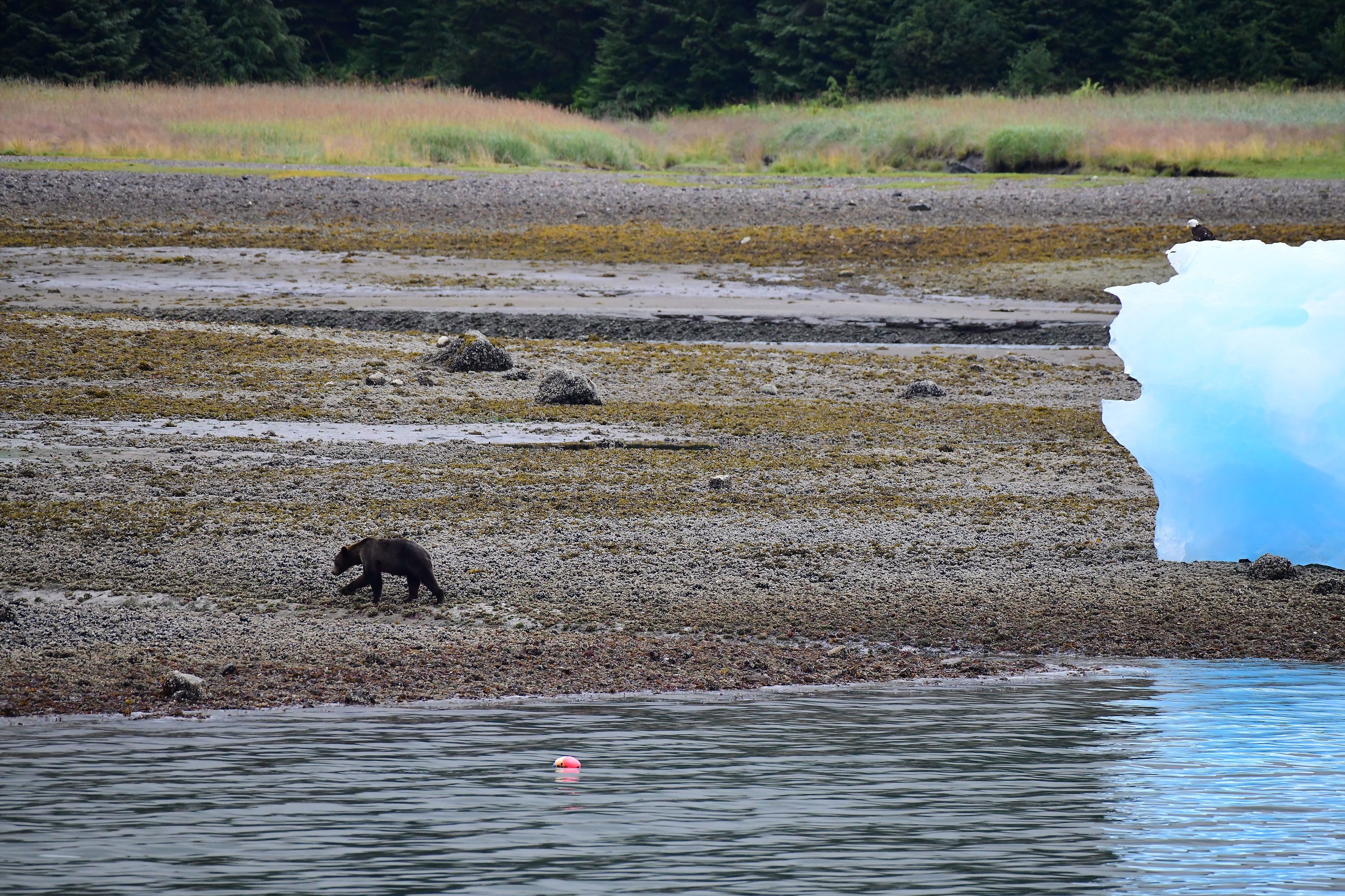 Wow, what an introduction to Southeast Alaska! Our day started at Holkham Bay, crossing the bar surrounded by surf scoters, Bonaparte’s gull, loons, marbled murrelets, and pigeon guillemots. As we started down Endicott Arm, we were soon interrupted by two brown bears and a multitude of bald eagles along the shoreline. One brown bear searched at the foot of an iceberg left high and dry by the tide as a bald eagle watched from atop—a quintessential Southeast Alaskan view.