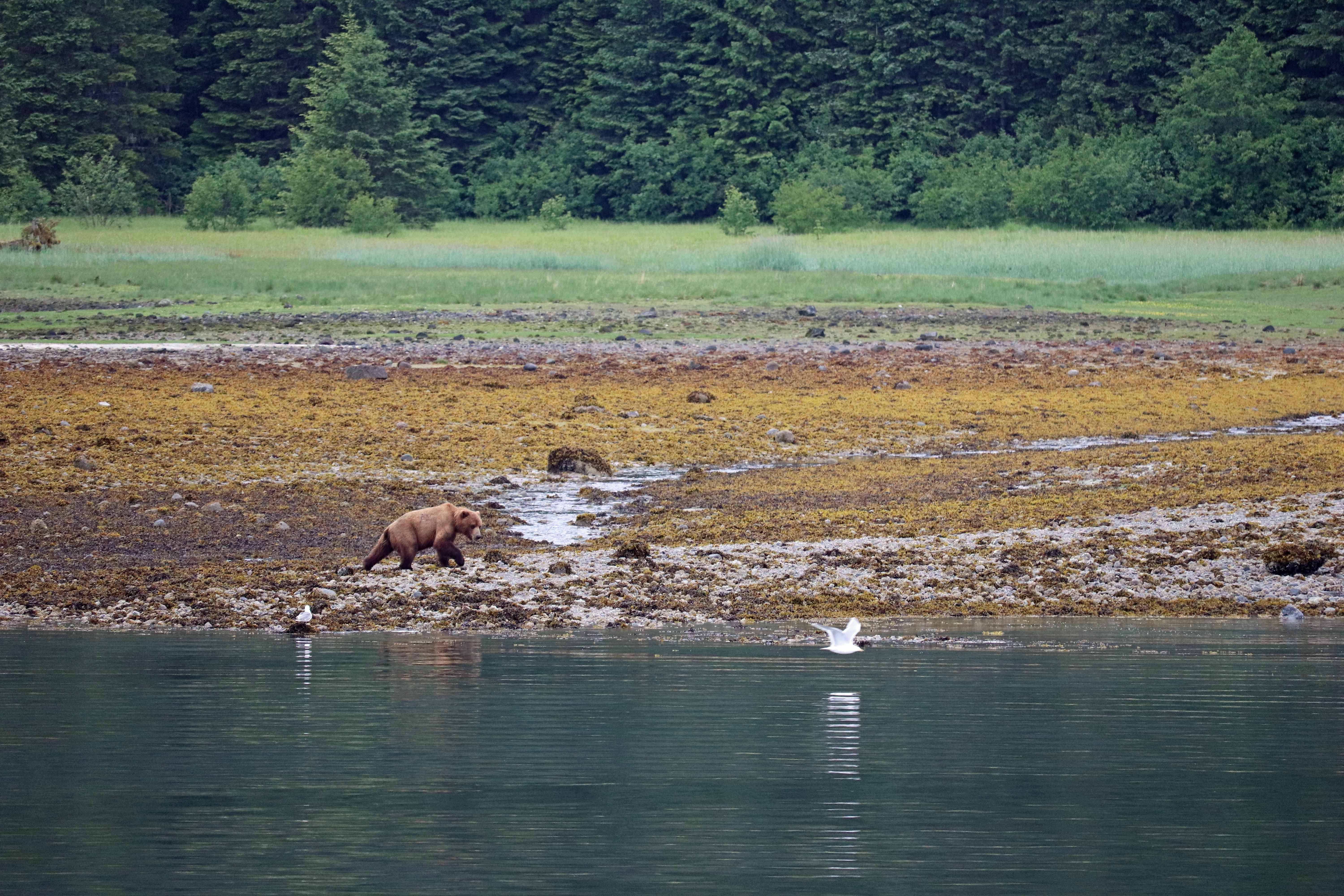 As we cruise on our way to Endicott Arm, our ship takes pause to relish an encounter with a brown bear (thanks, Bosun Lilly!) that was shoreside and seeking out fresh barnacles and mussels.