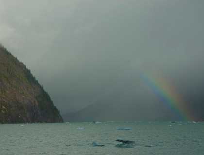 Not long into the morning stretch class, one of the naturalists came back with index finger over lips and a “shhhhh…” to let us know there was a black bear along the shoreline.  Many chose to move to the railing and put cameras and binoculars to eyes.  Those who remained came into a tighter-knit group and whispered so as not to disturb the bear or viewers.  A magical element hung in the misty air.  And then, off the stern of the ship, the vivid bands of red, orange, yellow, green, blue, indigo, violet… a rainbow!  How fitting for our first day on board.  The expedition had officially begun.