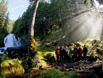 We boarded our trusty expedition landing craft after breakfast to investigate the ice, waterfalls, and surrounding terrain in closer detail. Bright sunlight glinted across the luminous blue bergy bits, but it was still fairly chilly from cool winds rolling down the glacier towards us. Each group of travelers saw slightly different things on our outings. Harbor seals poked their shiny round heads above the surface to watch us pass. We steered clear of those hauled out on the ice to avoid disturbing their naptime. Two harbor porpoises circled our boats and even raced alongside the bow, behaviors very uncommon for these rather shy creatures. The glacier itself was magnificent, with precarious spires called seracs rising from the sea, poised to collapse at any moment. Glacier watching requires patience. One can wait for hours and see no real changes or be lucky and see giant slabs of ice fall all at once from the face. We had some of both. A spectacular calving event generated rolling swells that gently rocked the little boats and the ship itself for several minutes. While we enjoyed the glacier, a boat arrived with crew to serve us hot chocolate and whipped cream. What a treat! Eventually all returned to the Sea Bird to follow the fjord out to its mouth and into the larger body of water known as Stephen’s Passage.
