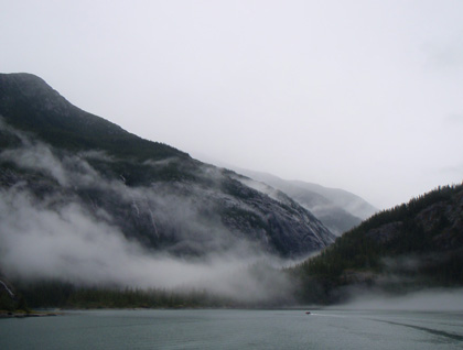 The morning’s opening scene was framed by steep, granitic walls with a soft, misty quiet. As we traveled further up Endicott Arm, the water’s color changed to a creamier green. We discovered why when Dawes Glacier came into view. As this tidewater glacier carves its way down the u-shaped valley, it grinds the bedrock into silt, then drops it off when it gets to the sea. The hazy light brought out every color of blue and green imaginable in the water, the rock and the vegetation all around us.