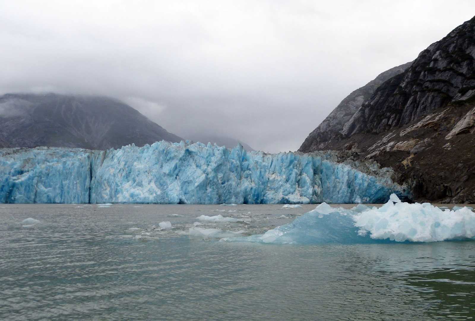 Imagine, if you will, Southeast Alaska as it was some 12,000 years ago (a mere blink of the eye in geological time.)  The continental glaciers had retreated from most of the northern part of North America, but they lingered a bit longer in Southeastern Alaska.  Virtually all of the land was under ice that formed in the mountains and flowed downhill as glaciers.  As it moved, the ice carved the landscape, leaving behind U-shaped valleys.  When the continental ice melted and glaciers retreated into the mountains, sea level rose and the deeper valleys were flooded to become fjords, the channels through which we travel on our excursion around Southeast Alaska.  Endicott Arm is one such passage.  It cuts into the mainland of Alaska, reaching almost to the border with Canada.  We passed myriad waterfalls descending down the steep granite walls of the fjord.  Icebergs floated past.  Many of them were a brilliant blue, the ice reflecting the blue end of the light spectrum.  At the head of the fjord, we found their source: the Dawes Glacier.  It was raining at sea level, but in the mountains above us, it may well have been snowing, to be transformed into more ice that will fuel the relentless downhill motion of the ice.