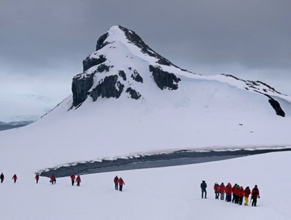 In the afternoon we had our first opportunity to step ashore on Half Moon Island. The most adventurous of the group decided to go for a longer walk up a hill and across the island for a fantastic viewpoint. Everyone had a chance to spend time at our first penguin colony and see the chinstrap penguins nesting in the snow-free areas on the island. The penguins are still busy sitting on eggs during this time of the season. We also saw lots of penguins commuting back and forth from the beach to their nest mounds. It was a wonderful chance to just enjoy the excitement of our first landing in the Antarctic.