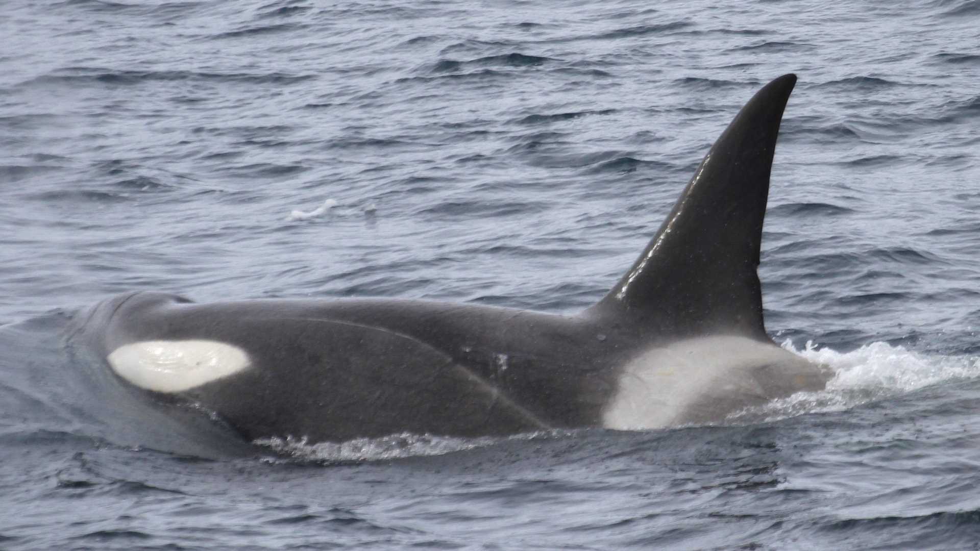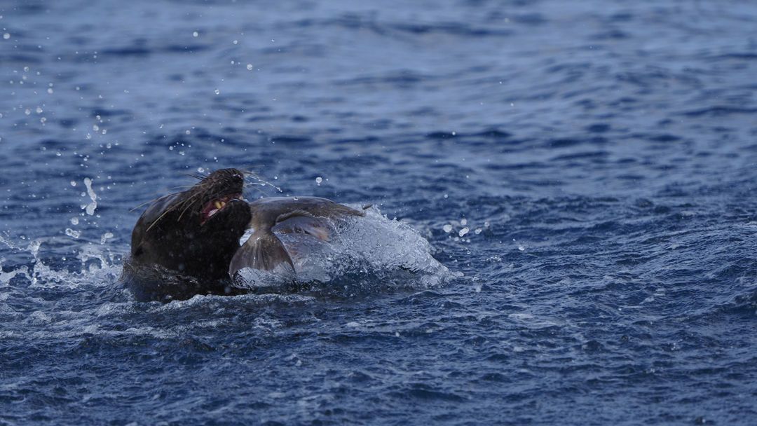 After these wonderful early morning encounters, we continued to move towards our next objective, the massive iceberg A68A, the 87-mile-long ice island that broke off the Larsen C ice shelf two years earlier and now lies grounded near Seymour Island in the Weddell Sea. Ship-cruising along its endless northern face, we were thrilled to come upon a group of pack ice killer whales, at least 15 individuals of type B1, hunting along the edge of the brash ice. These large predators are specialists in hunting sea mammals on the sea ice, especially the Weddell seals, and it was fascinating to observe them against the stunning background of the giant tabular iceberg.