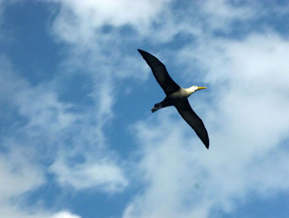 As we started to walk among the lava, we could see that erosion had converted the lava flows into boulders. At about the middle of this trail, we found the nesting grounds of the waved albatross, and we were lucky enough to see the first pair of males circling the landing area and eventually landing just in front of us—what an incredible encounter! The albatross is an oceanic bird that spends most of its life in flight, only coming to land to reproduce. They have chosen this particular island to nest because of its cliffs, from where they can easily take off.