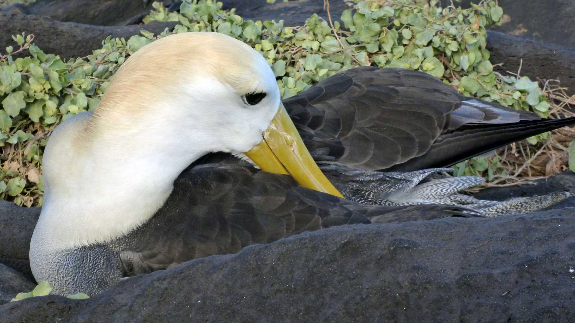 As we began our walk across the lava, we could see that erosion had converted the lava flows into boulders. The aerobic walk took us to the nesting ground of the waved albatross, one of the part-time inhabitants of this place. We were lucky enough to spot a few of them still on the island—we know that by the end of the year they will all be gone! The albatross is an oceanic bird that only comes to land to reproduce. They like to nest here due to the cliffs, which help them to take off. Being oceanic, they are big, and need the help of the wind to make it in flight.