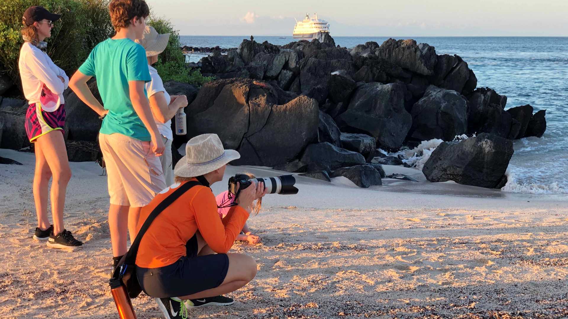 We began our morning with a great breakfast while anchored in Garner Bay. All the activities in the morning included time in and around the warm Galapagos waters. Some went deep-water snorkeling and had the chance to see a variety of fish distinct in both shape and color. There were marine iguanas feeding in the water, sea turtles, and a bunch of sea lions following and playing with us! Other guests went to the beach to get some snorkeling lessons provided by our expert naturalist, where they also had the chance to enjoy additional time with the sea lions. After, we all gather to conclude our adventures at the beautiful coral beach. We were surprised by the wonderful hotel staff over an amazing Andean lunch. Afterward, we sat in on a series of photography lessons from naturalist Walter Perez.