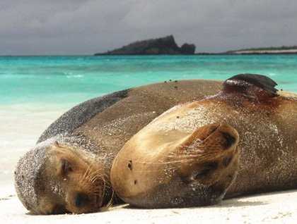 In the early morning, we dropped anchor at Gardner Bay, on the northern coast of Española. This is the oldest island of the archipelago, and a very interesting one. Gardner beach is one of the most beautiful beaches in the Galápagos; its fine white sands are the perfect spot for a colony of endemic sea lions, which we found sunbathing, sleeping or displaying their natural and unique curiosity towards us. Behind the beach, we were able to find other endemic creatures of Española, like the mockingbird and the lava lizard. This is a very serene place where one can commune with nature, and a stroll along this stunning beach was a must. Our more experienced snorkelers had a chance to explore the underwater world of the Galápagos at Gardner Islet, not far from the beach. Here they had close encounters with some playful Galápagos sea lions, as well as various species of local fish like the blue-chin parrotfish and the razor surgeonfish.