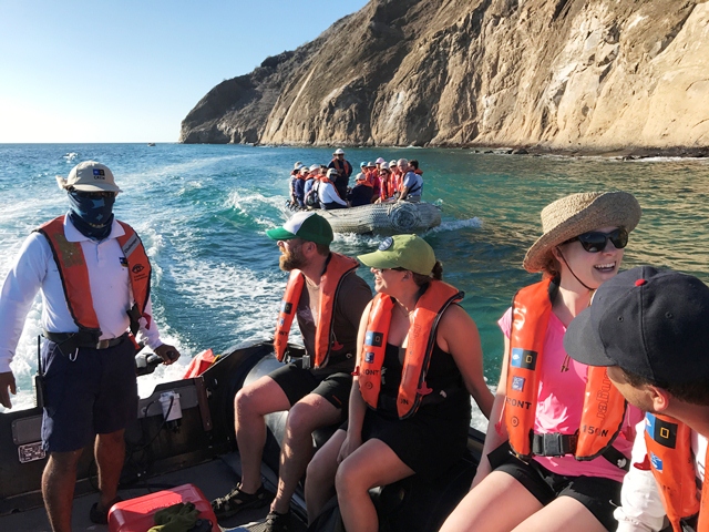 A day of colorful diversity and life awaits us as we start at Gardner Bay along the northern coast of Española. As the sun alights us we find that we are floating over turquoise waters, with a bright white, coralline sand beach in the distance. This morning we start our exploration of the undersea world as we head to the beach of Gardner islet. The water temperature is an invigorating 63° F as we enter the crystalline waters, immediately encountering a young Galapagos sea lion that decides to blow bubbles at us and swim circles around us. In the shallows we find cornet fish and Mexican streamer hogfish with the occasional damselfish protecting their algae “gardens”. Heading into deeper waters, a wall of vibrant invertebrates is before us, with bright orange cup coral standing out and chocolate chip sea stars lining the benthic area. A group of young sea lions start to follow us and swim with an incredible agility, as their mothers forage in the deeper surrounding waters. Galapagos sea lions can nurse for up to two years due to their relatively slow growth rate and low milk fat content of the mother’s milk, allowing them time to “play” along the shore, learning the skills to eventually be able to fish on their own. Landing on a long white beach, we are able to get a close look at the sea lions as they laze in the sun to recuperate their energy after long foraging runs offshore. We appear to be followed constantly by the Española mockingbird that is protecting its territory and searching constantly for sustenance during this dry season. Española’s older age in the archipelago allows us a chance to see what has developed uniquely over time on this chain of islands, in isolation from South America—many of these species are endemic only on this island.