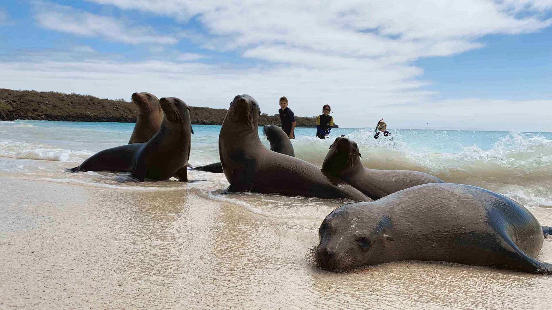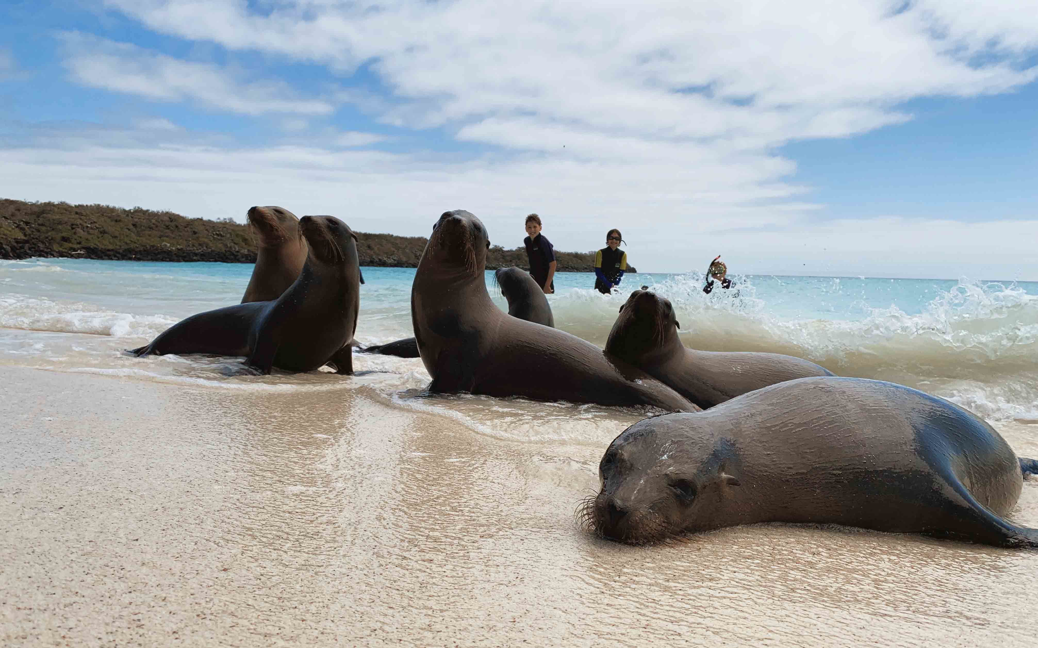 Located in the southeast portion of the Galapagos, Espanola is considered the oldest island in the archipelago. It has no active volcanoes or freshwater but houses exuberant fauna. Early in the morning, with a calm sea and a cool breeze we set for our day of exploration. We kayaked along the shore of Espanola Island and enjoyed the incredible landscape this location has to offer. Sea turtles were everywhere, and the ocean was so clear that it was possible to observe them resting on the ocean floor like floating rocks. Blue-footed boobies and frigatebirds flew overhead looking for fish, taking full advantage of the ocean conditions. After breakfast the sun appeared to warm up the waters – right on time for our next snorkeling activity. As soon we got into the water, more than 15 juvenile Galapagos sea lions approached, giving us an “official welcome” to Gardner Bay. They were our curious companions during the entire snorkeling session. It was amazing to play with them, making bubbles, swimming further down, or imitating their movements. Some sea lions advanced quickly to then jump over our heads! It was a great experience for everyone. Afterward we headed to the white beach of Gardner Bay where we observed mockingbirds and their fearless interaction with our guests. We also saw lava lizards walking on the sea lions’ bodies, trying to catch insects to feed on. All the while, the top predator of the archipelago, the Galapagos hawk flew close to the nearby rocks looking for marine iguana.