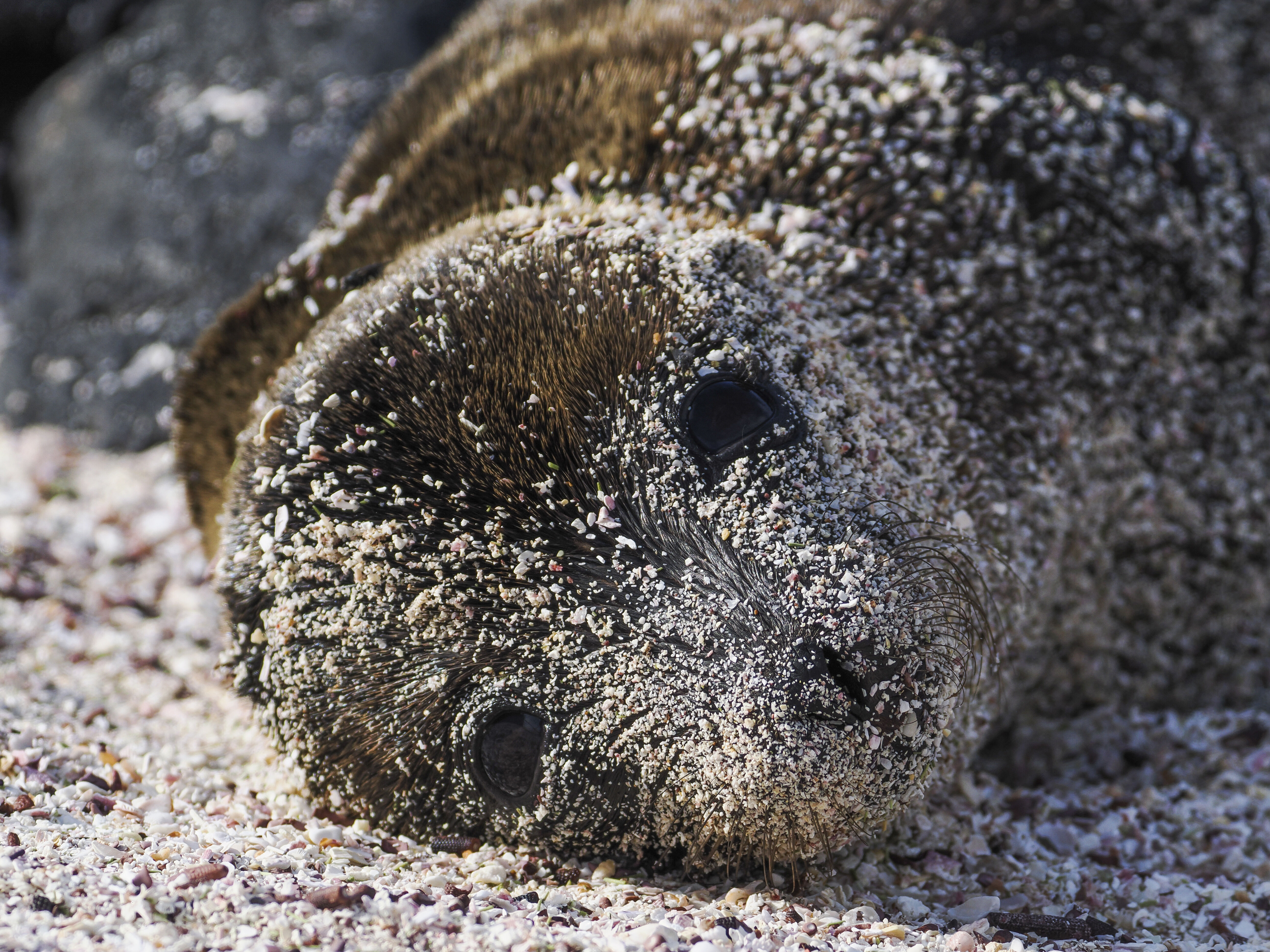 In the afternoon, we walked along this eroded ground to admire the marine life that lives here, including marine iguanas, sea lions, and hundreds of marine birds. One of the highlights of our hike was the waved albatross. These birds are easy to spot, as their babies are continuing to grow before they leave the island at the end of the year. Nazca boobies and blue-footed boobies were on full display because the ocean productivity is high. They were nesting and mating all along the trail.