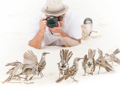 Galápagos sea lions and the endemic Española mocking bird greet us as we step on shore a perfect sandy beach in Gardner Bay just after sunrise. It’s fun to watch the antics of the sea lions playing in the waves. Meanwhile, the mockingbirds stake out their turf, tussling with each other in family gangs. Laying in the sand, we get down to photograph at eye level. It takes burst mode and a lot frames to get the wings out in full display.