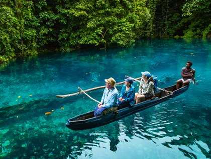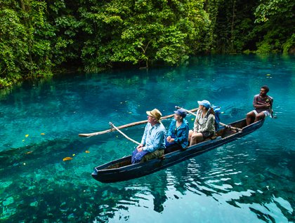Rounding out the activities for the day, the paddlers among us board traditional outrigger canoes for a short trip up the Riri River to a tropical paradise called the “Blue Hole.” It’s an exciting time enjoying the cool, blue waters swimming and swinging from the rope swing. Later, we launch our fleet of inflatable kayaks to explore another jungle river not far from the landing. It’s calm and quiet upstream, where tall mangrove trees line the meandering tidal channel.