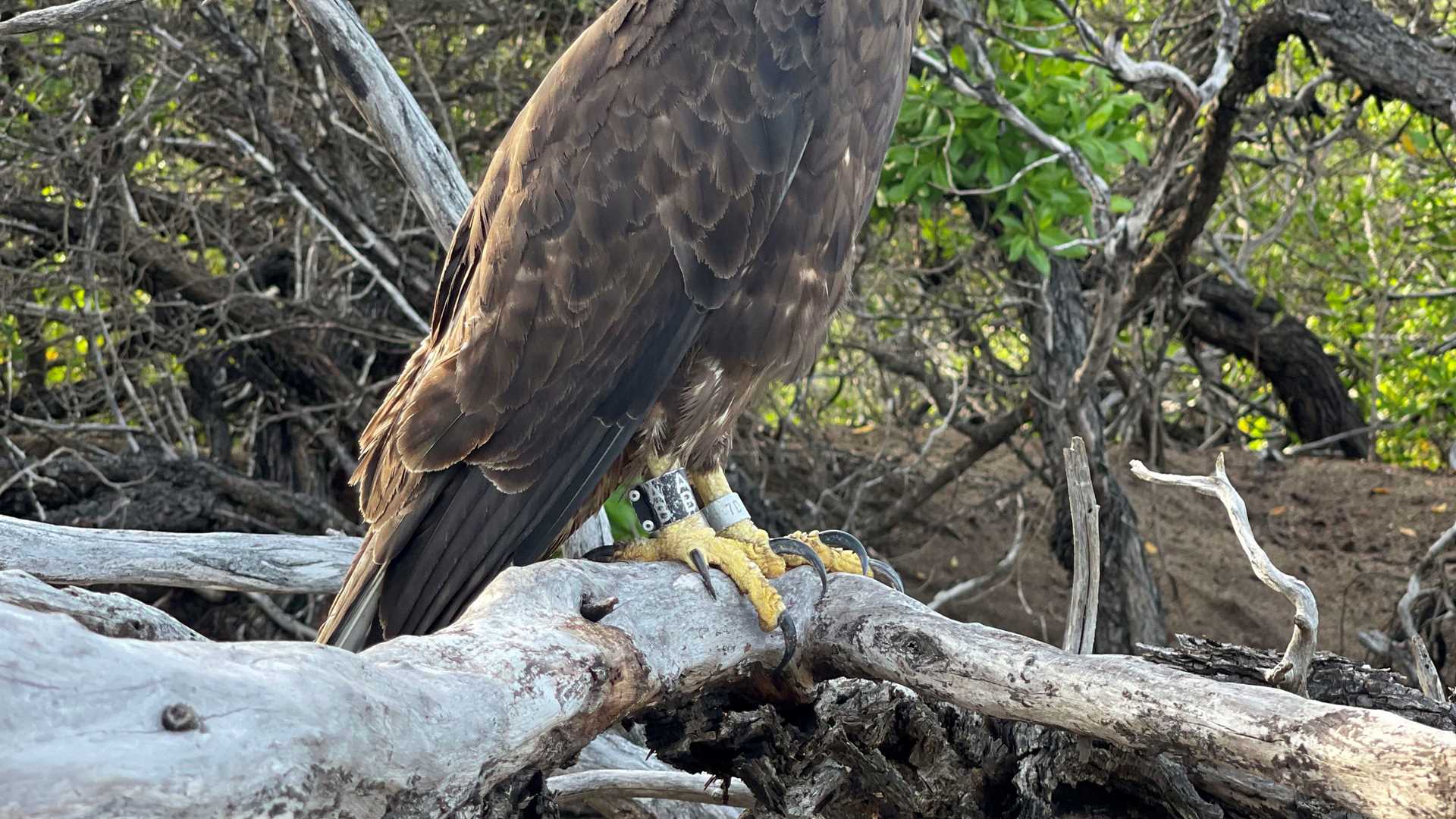 Photo caption and photographer: An adult Galapagos hawk roosts in a small tree as it watches people pass by. Photo by Gilda Gonzalez