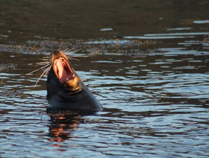 After breakfast, we crossed the equator and went out on the southern hemisphere on a Zodiac ride, along Punta Vicente Roca, a very productive place of the Galápagos, where an upwelling zone of the Cromwell current is situated. Some Galápagos penguins were seen on the rocks, large marine iguanas basking on the tuff walls, flightless cormorants bringing some nesting materials along the shore. Fur seals were getting some shade under the rock slides off the gigantic cliffs reaching the sky from the shorelines of this island.