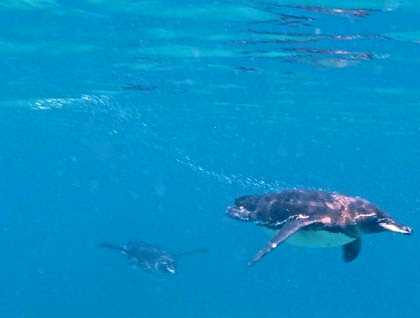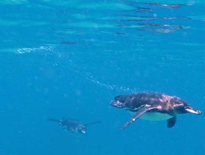 After breakfast, we were already near Ecuador Volcano, a spectacular shield volcano, which is crossed by the Equatorial line, and has collapsed into the ocean leaving fascinating views of the inner caldera wall and the caldera floor. The ship dropped anchor at the southern end of the caldera, in an area called Punta Vicente Roca, where we took a Zodiac ride along the coast of Isabela Island, looking for penguins, cormorants, sea turtles, marine iguanas, and sea birds. Later on, we went back to the ship to get ready for our deep water snorkel in the same area. We were swimming with turtles, penguins and the always curious flightless cormorants.