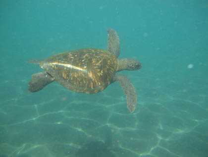 During the walk we see many animals, including big herds of marine iguanas, sea lions, sea turtles, flightless cormorants, a snake, a hawk, and several shore birds. Most of us are surprised at how the abundant wildlife doesn’t seem to notice us. Many interactions are observed, and the three hours spent on this small site feel like only minutes. Isabela Island, with its large shield volcanoes, dominates the horizon.