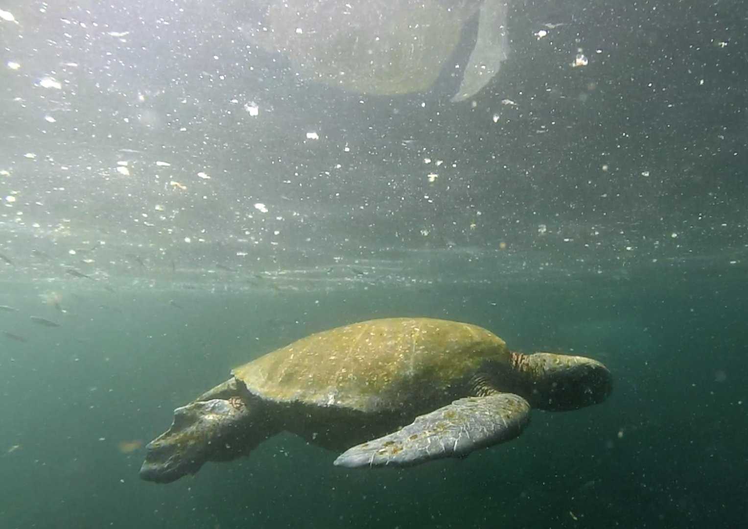 We arrived to the shallows, where sea turtles swam peacefully while others warmed their bodies on the nearby rocks, which were covered completely by green algae. This tranquility was interruptws by a noisy sea lion which was barking constantly, warning other males not to enter his territory. Finally, we arrived to the flightless cormorants’ zone where many of them were seen opening their stumpy wings, drying out their wet bodies after a successful morning of fishing.