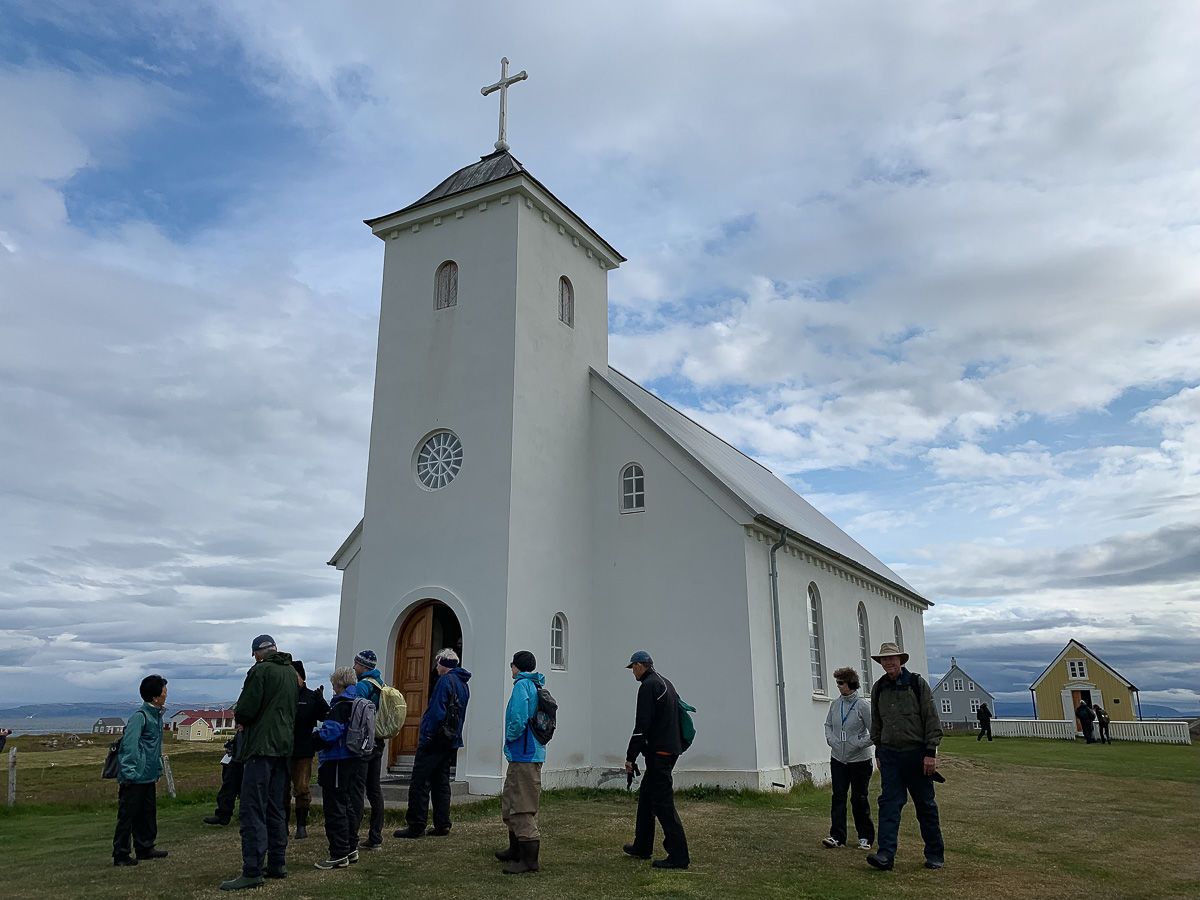 The Lutheran church on the brow of the hill contained a wonderful mural executed by a vising Catalan artist, Baltasar Sander, who offered to paint the mural in exchange for board and lodging on the island back in the 1990s. Christ is depicted wearing an Icelandic sweater and a white-tailed eagle soars above his head. The mural recounts the history of the island from pre-Christian Viking days, through Iceland’s incorporation into western Christendom and subsequent adoption of Lutheranism in the 16th century. The island is famous throughout Iceland and beyond as the home of the Flateyjarbók, the largest illuminated manuscript to be written in Icelandic. In private possession on the island for centuries, the manuscript was coveted by the Danes who eventually acquired it from its owner in exchange for an area on the mainland larger than the island itself. Following independence, negotiations opened with Denmark that culminated in the return of the manuscript, to great national rejoicing in 1971. Today it has pride of place in the Culture House in Reykjavik. A facsimile of the Flateyjarbók is housed in the delightful bijou wooden building behind the church, Iceland’s oldest public library, the size of a garden shed but containing a fine selection of books in Icelandic on local history topics and, of course, the sagas. Thanks to our ethnomusicologist, we were treated to a concert by a fine trio of Icelandic folk musicians in the village hall.