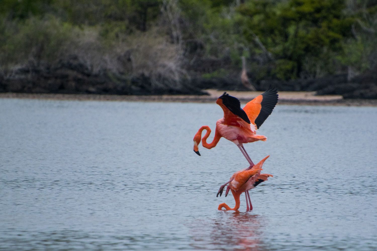 During the walk, we saw at least seven pairs of greater flamingoes nesting by the shore of the brackish water lagoon. Several flamingoes were also feeding on brine shrimp, their bright pink color in striking contrast with the surrounding lava flows. By this lagoon we also encountered white-cheeked pintail ducks swimming and feeding on invertebrates. One of the highlights this morning was to observe several pairs of blue-footed boobies engaging in their courtship ritual by the small cliffs along the beach.