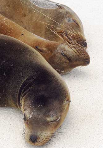 Early in the morning we steered Zodiacs to the green-colored beach of Cormorant Point. Walking along the shore, we saw sea lions dozing and blue-footed boobies nesting along the end of the beach with their chicks underneath them. We arrived at the lagoon behind the beach, where we observed waders, such as black-necked stilts and greater flamingos, feeding on small crustaceans.