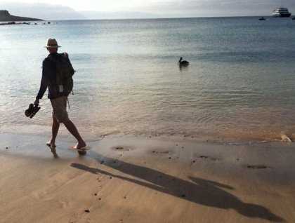 Early in the morning, we landed at Punta Cormorant for a scenic walk exploring the dry forest and its inhabitants. Here we found yellow warblers, blue-footed boobies, Sally Lightfoot crabs, and many other creatures. A flycatcher became very curious about one of our guests and tried to land on her a number of times.