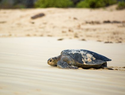Before breakfast, we went ashore on Punta Cormorant, with a fascinating beach of olivine sand. Here we walked along a large salt pond, where a few flamingos were spotted.  The trail surrounded by endemic and native vegetation led us to a second beach of incredibly fine, white, coralline sand, a favorite nesting site for green sea turtles. Turtle nesting activities are still underway here, and we were lucky enough to see a healthy female heading back to the ocean after laying the eggs. What an incredible way to start the day!