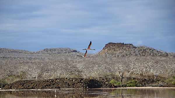 Our early risers had the opportunity to enjoy a spectacular sunrise, followed by a moderate-paced walk on an easy trail that goes right through a brackish water lagoon, where many different kinds of birds congregate. We continued to the other side of a tuff cone to a white sand beach where sea turtles nest. Several hundred of stingrays live here permanently and can be seen underneath the breaking waves along the beach. At the landing beach, we saw flamingoes and penguins together—unbelievable!