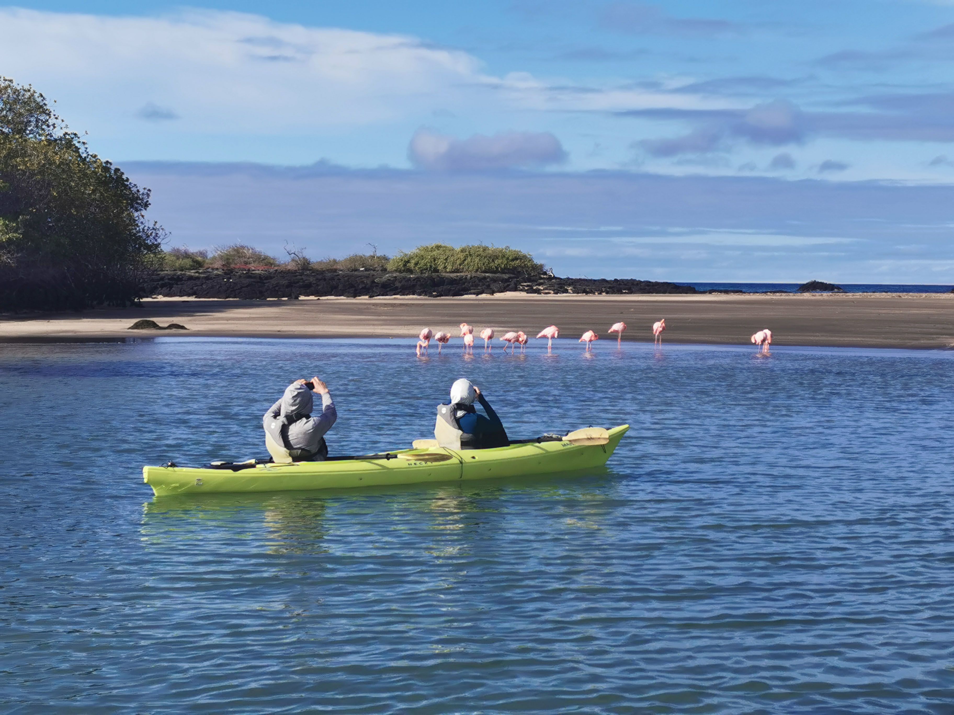 By 6:30 a.m. we were already headed onto dry land for a short hike through a greenish-brown sandy beach. The sand here contains olivine crystals and are considered semi-precious stones. We visited a brackish water lagoon with greater flamingos and saw pintail ducks and others migratory birds usually in their company. The trail ended at a white coralline sandy beach where green sea turtles nest through the year and diamond stingrays are concentrate by the dozens along the shore under the breaking waves. We also saw Sally Lightfoot crabs contrasting with the dark lava.