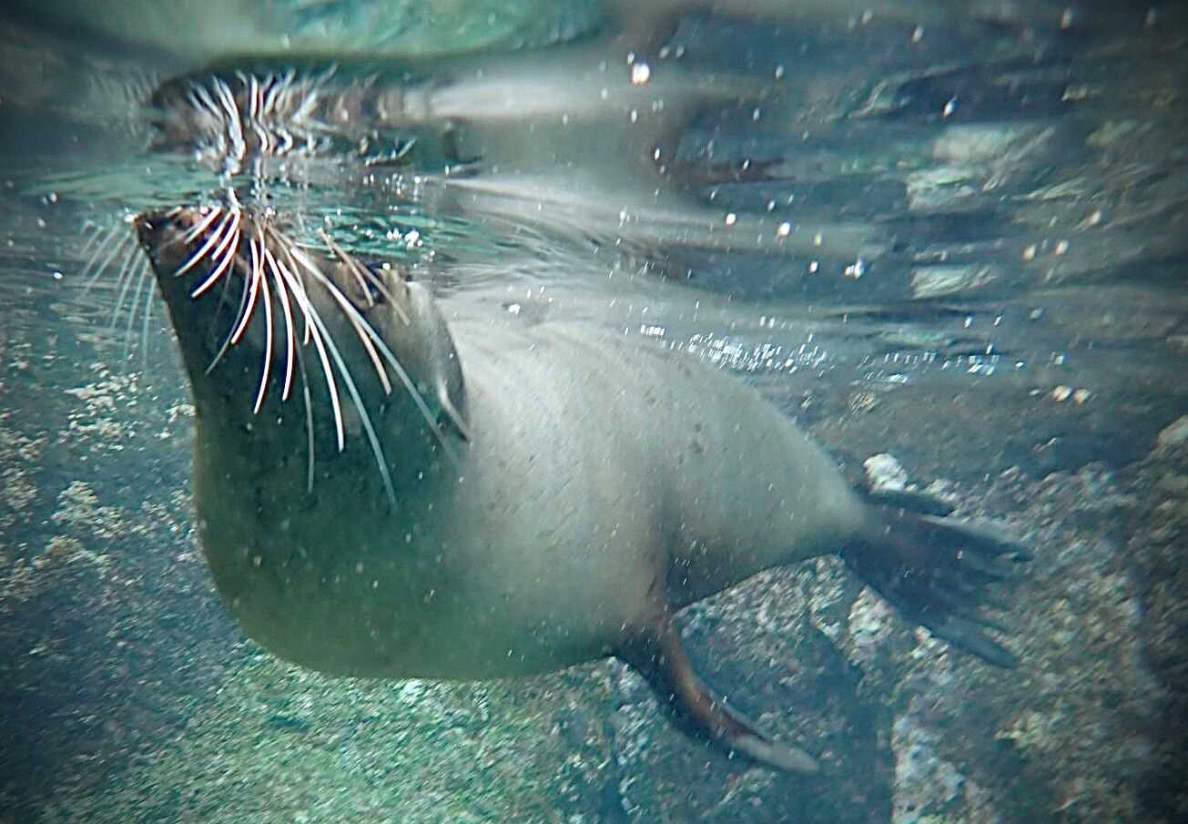 Between breakfast and lunch, we played in or on the water around Champion Islet, just to the northeast of Floreana Island. We didn’t make a landing but explored by Zodiac, including a birdwatching circumnavigation followed by deep-water snorkeling in incredible waters with parrotfish, angelfish, pufferfish, damselfish…all kinds of fish! Sea lions buzzed by, desperate to draw attention and get a reaction out of us, which they did. Squeals and shrieks were heard.