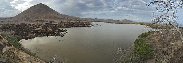 Floreana Island is a special place to see some of the more rare species of flora and fauna in the Galapagos National Park. To maximize our 12 hours of daylight here on the equator, our wake-up call came at 5:30am with a 6am landing on a reddish sandy beach of Punta Cormorant. Besides a few lounging sea lions on the beach, our first wildlife sighting was a flock of five pink flamingos gliding in for a landing on a large estuary a short distance away. At the end of a tunnel of trees, the scene opened up to a spectacular eye level sight of approximately 80 pink flamingos feeding in a shallow estuary framed below the backdrop of a stark volcanic landscape. The trail then climbed up to a higher vantage point that offered one of the quintessential panoramic views of the Galapagos, with flamingos as far as the eye could see. A short distance away was a long lonely white sand beach, very different in geology and texture compared to our landing site. It was impossible not to notice the hundreds of baby turtle tracks covering the white sand dunes above the high tide mark, and a few large female sea turtle that left definitive tracks as they were heading back to ocean after laying eggs last night.  What a productive morning, all before 8am when we departed from beach and headed back to the ship.
