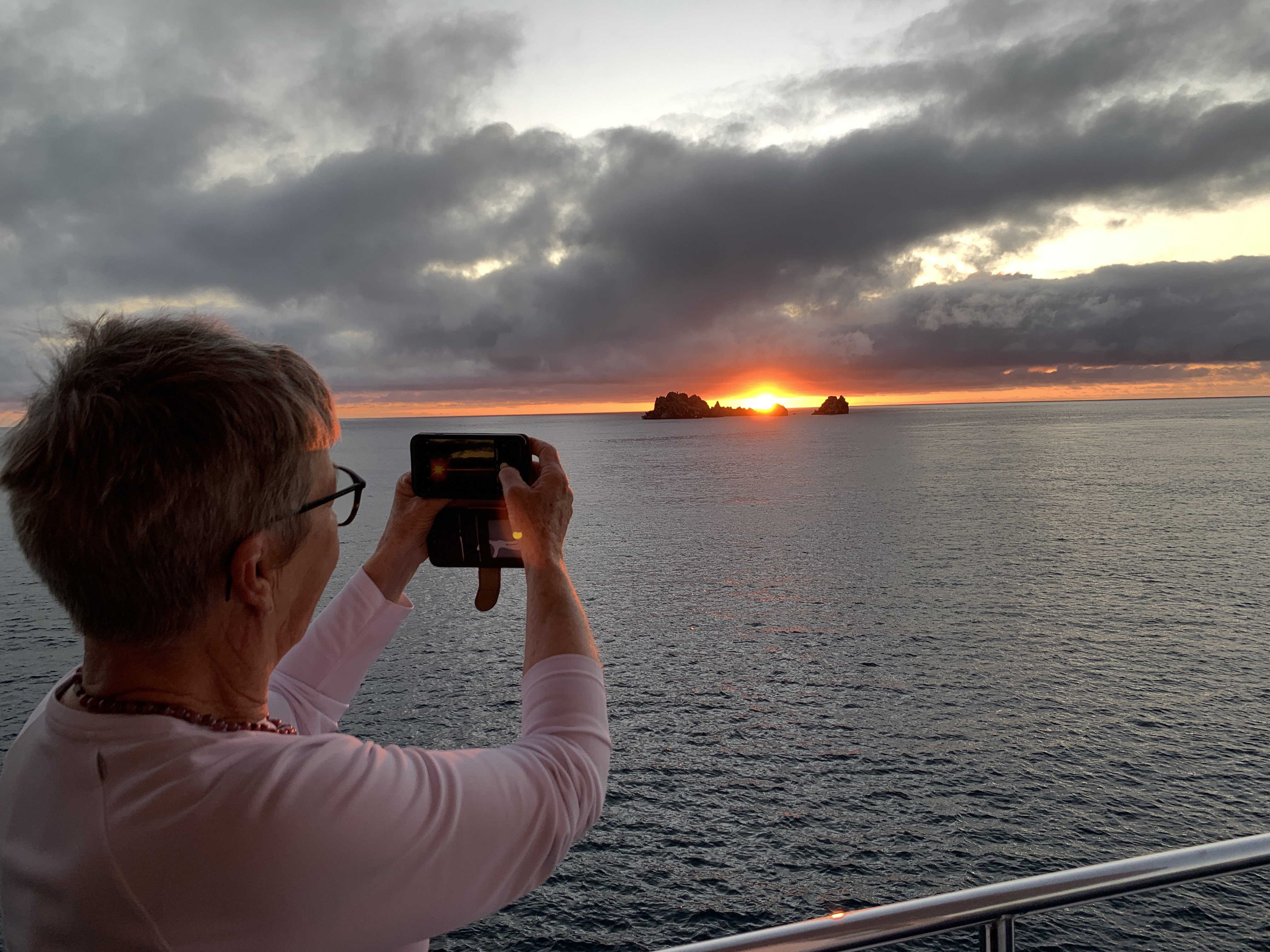We had an exceptional day on Floreana Island. Our morning started with a fiery sunrise behind Devil’s Crown, which gave us motivation for our pre-breakfast activity. Landing on one of only four green sand beaches in the world, we spotted flamingos and blue-footed boobies. The colorful contrast in flora and fauna was astonishing.