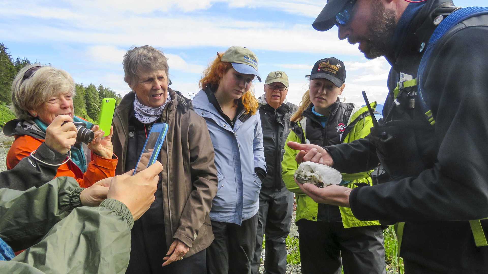 Wandering further into the vegetation, we discovered deer bones, a sea otter skull, blooming shooting stars, and a very special place belonging to the bears. For reasons still not completely understood, brown bears walk in exactly the same steps, year after year, creating depressions in the moss and earth. These tracks may be centuries old and are what we call “perennial bear tracks”.