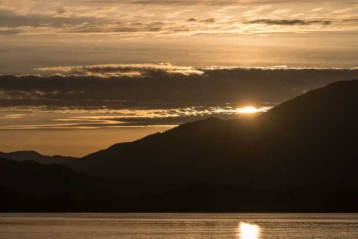 A few of us rose early to photograph morning light from the ship. We were treated to lovely clouds at sunrise, as we sailed along through Fritz Hughes Sound in calm waters. An occasional floating log went by carrying a few gulls catching a free ride and a rest. The layers of mountains were shades of black and blue-grey separated by the atmospheric haze and resembled a Japanese painting.