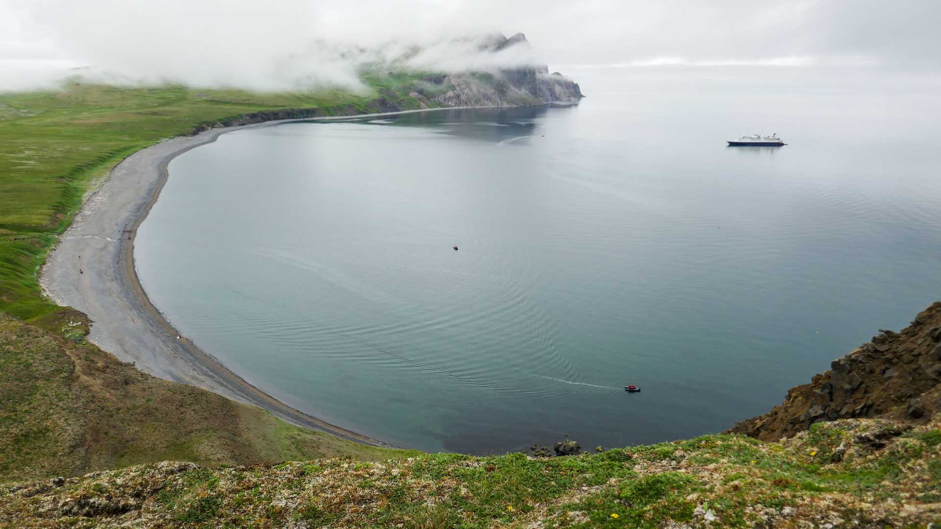 On top the ridge we found reindeer antlers buried deep in moss which helped to tell the story of their introduction in 1944 when 29 reindeer were brought here to provide an alternative food source for the men stationed at the weather and Loran station during WWII. When the war ended and the men left, hunting of the species had ceased, and by 1963 their population grew to 6,000. Reaching their carrying capacity, they quickly depleted the lichens, their primary winter forage, and a harsh winter in 1963 took its toll on the population, leaving 40 emaciated females and one infertile young male. Over the next few years the reindeer perished, and by the mid-80s there were none. The view from the top of the ridge down to the landing on Bull Seal Beach was absolutely amazing, as was our view of parakeet auklets, fulmars, and puffins.