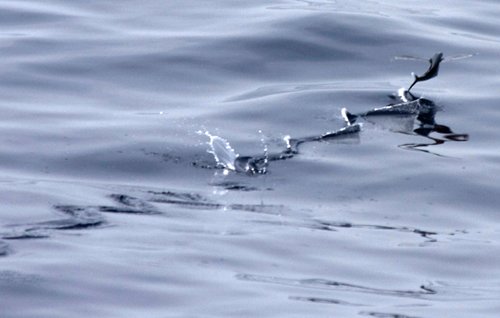 A call from Jim Kelley summons a crowd forward. Dolphins are cavorting off the starboard bow. Not just any dolphins. Richard White and Mike Greenfelder conclude they are Clymenes, also known as Short-Snouted Spinners. They are rarely sighted and as a consequence guidebooks offer scant information on their numbers (presumed to be modest) and habits. What is known, from easy observation, is that when breaking the surface this dolphin may spin like a competition diver, landing on its back or side as it hurtles forward.