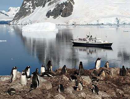 We continued to our morning destination and first landing on Danco Island, in the Errera Channel. Our Zodiacs were met by a greeting party of gentoo penguins. A walk up the snowy slope brought us to the breeding colony, where still-downy young raced against the impending onset of the Antarctic winter to complete their development. The successful few will join the breeding population and contribute to the population increase of gentoo penguins that is occurring along the Peninsula. Some adults, probably those who were unsuccessful in their attempt to breed this season, had entered their annual molt, exchanging old and worn feathers for a new set.