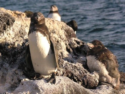 All of us, kayaking, snorkeling or doing a Zodiac ride along the coast of Santiago, got to see a group of Galápagos Penguins. These endemic marine birds were seen resting on the rocks.