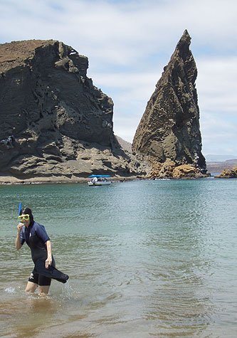 Snorkeling, swimming and trips in the glass bottom boat occupied the rest of the morning until noon. Just when we got well under way, a small pod of bottle-nose dolphins appeared – but so close to shore it would have impossible to turn the ship around…so onward we sailed to Santiago and her western coast, James Bay and Puerto Egas.